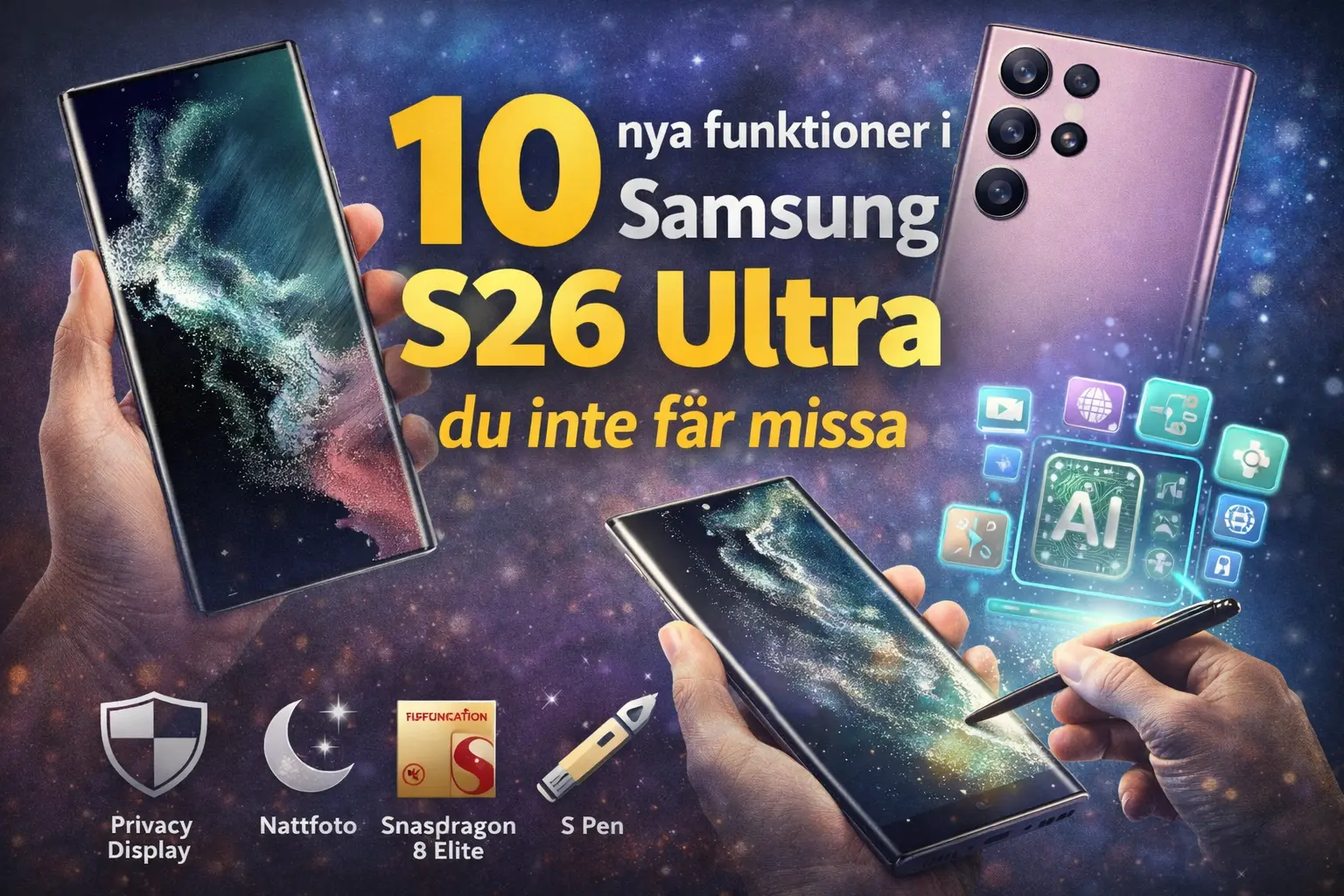 Samsung Galaxy S26 Ultra är här — och det är inte bara en uppgradering i prestanda, utan också en telefon full av nya funktioner som förändrar hur du använder din mobil. Flaggskeppet i Samsungs 2026-serie lanserades den 25 februari 2026 och har sedan dess blivit ett hett samtalsämne bland teknikentusiaster. I denna guide listar vi 10 nya funktioner i S26 Ultra som verkligen sticker ut — och som du inte får missa innan du bestämmer dig för att uppgradera.