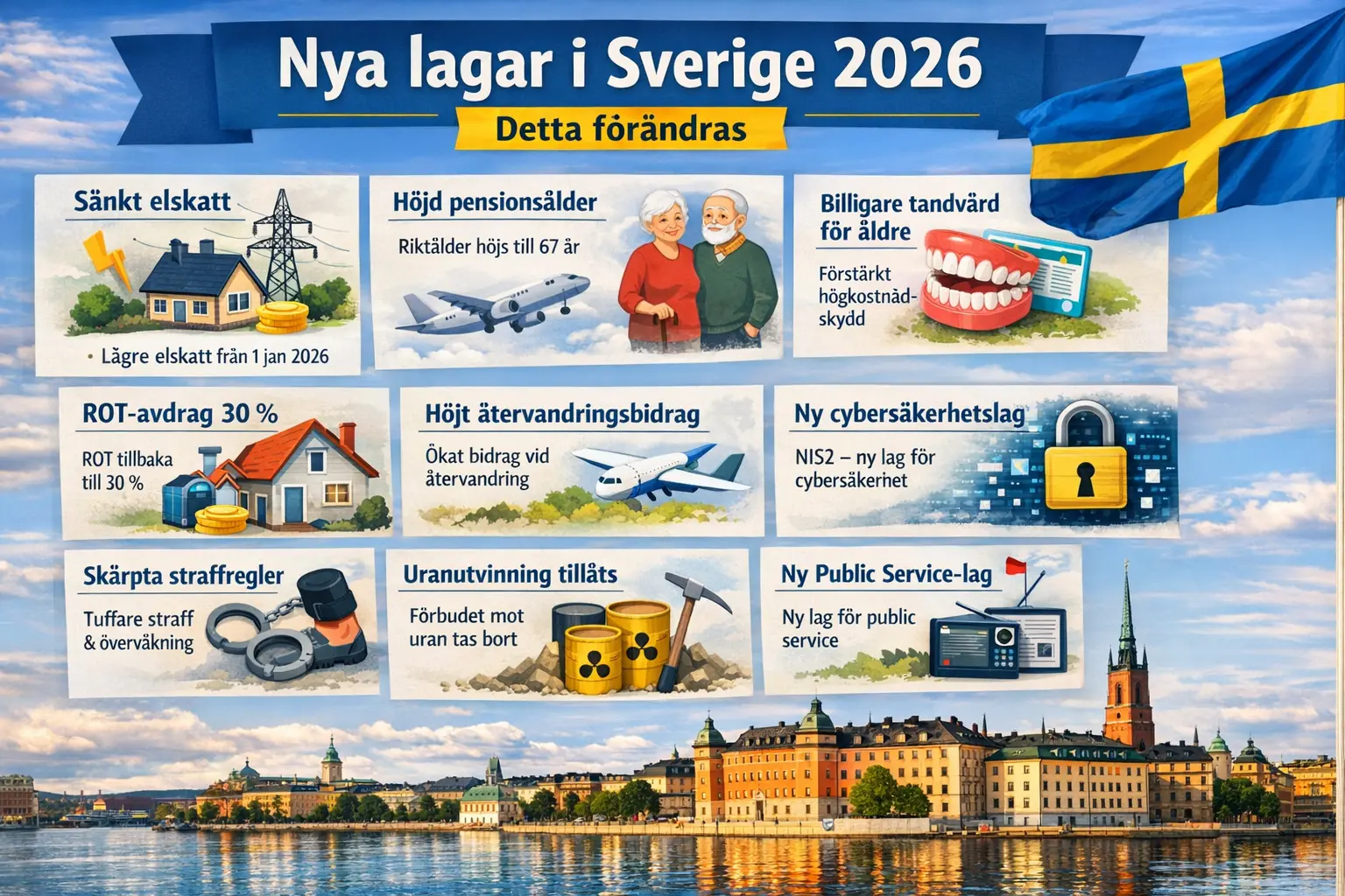 2026 innebär en hel del förändringar i Sverige – från skatter och avdrag till trygghetsfrågor, tandvård och nya krav kopplade till cybersäkerhet. I den här guiden går jag igenom de viktigaste lagarna och regeländringarna som träder i kraft under 2026 (många från 1 januari), vad de betyder i praktiken och var du kan läsa mer i officiella källor.