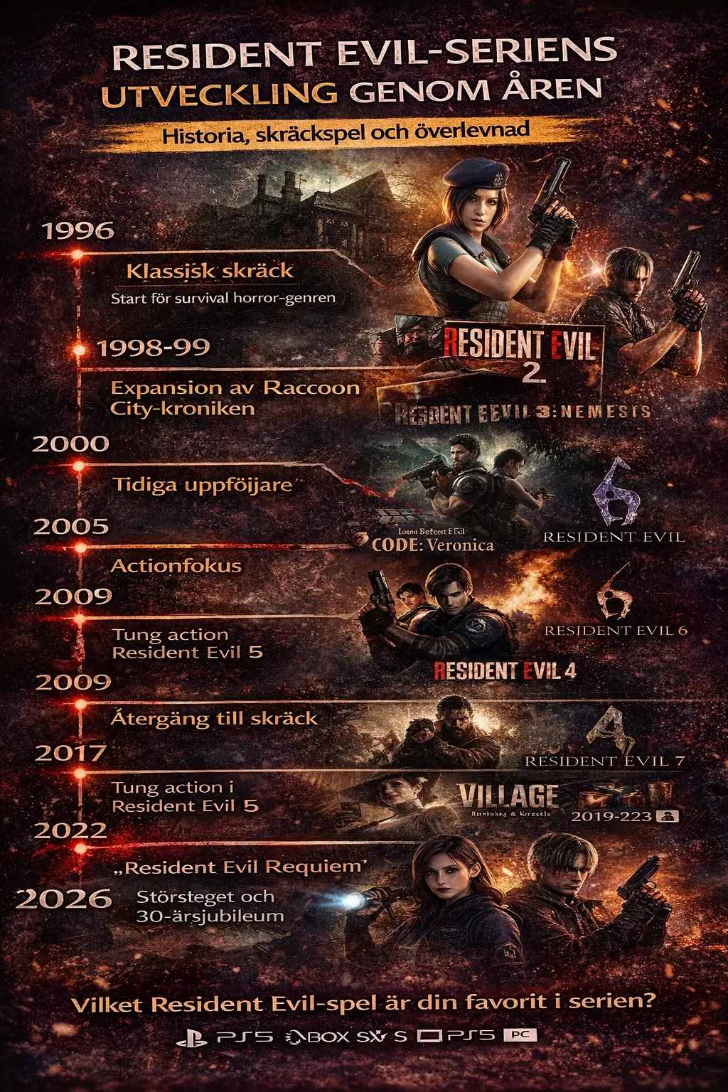 Resident Evil-serien är ett unikt exempel på hur en spelserie kan utvecklas över tre decennier samtidigt som den bibehåller sitt kärnvärde: skräck, överlevnad och berättande. Från den klaustrofobiska herrgården i 1996 till Requiem och modern teknik 2026 har Capcom lyckats utveckla serien, behålla fans och locka nya spelare – samtidigt som serien fortsätter att definiera vad survival horror kan vara i spelvärlden.