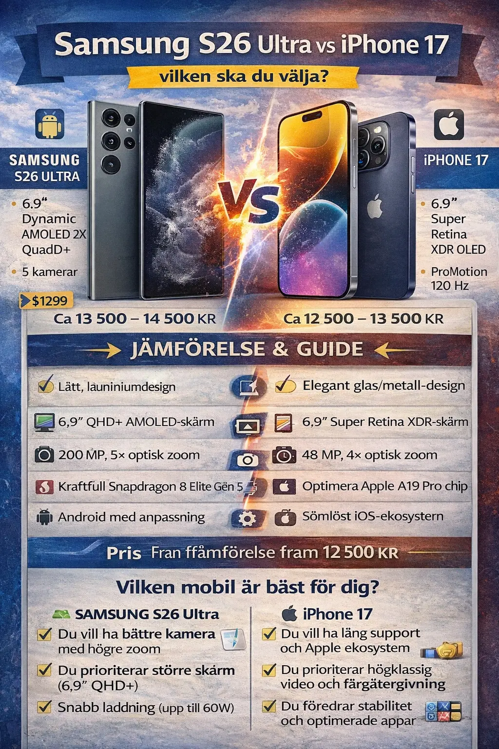 Både Samsung Galaxy S26 Ultra och Apple iPhone 17 är toppmodeller för 2026 och erbjuder exceptionell prestanda, kamera och användarupplevelse. Slutvalet handlar därför ofta om vilket ekosystem du föredrar och vilka funktioner du prioriterar mest – kamera, skärm, ekosystem eller batteri.